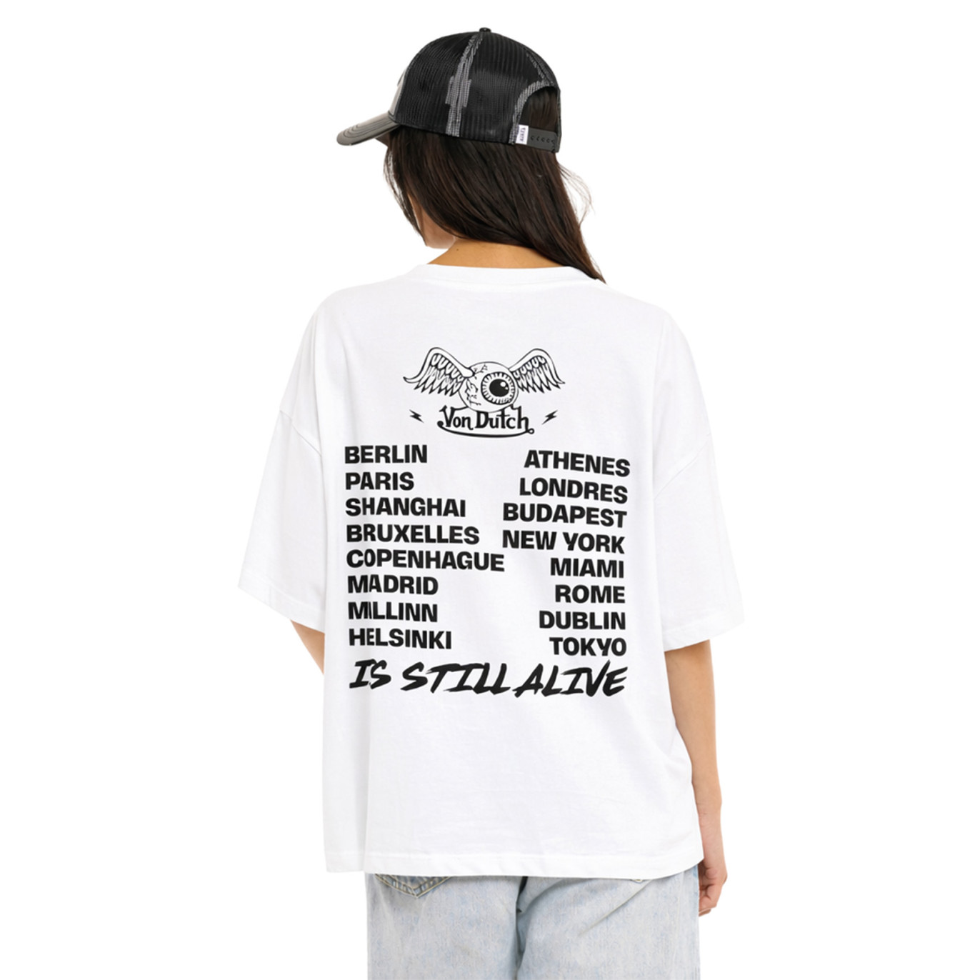 T-shirt femme Von Dutch blanc VANESS, une pièce oversize qui capte la lumière comme un néon sur l’asphalte.